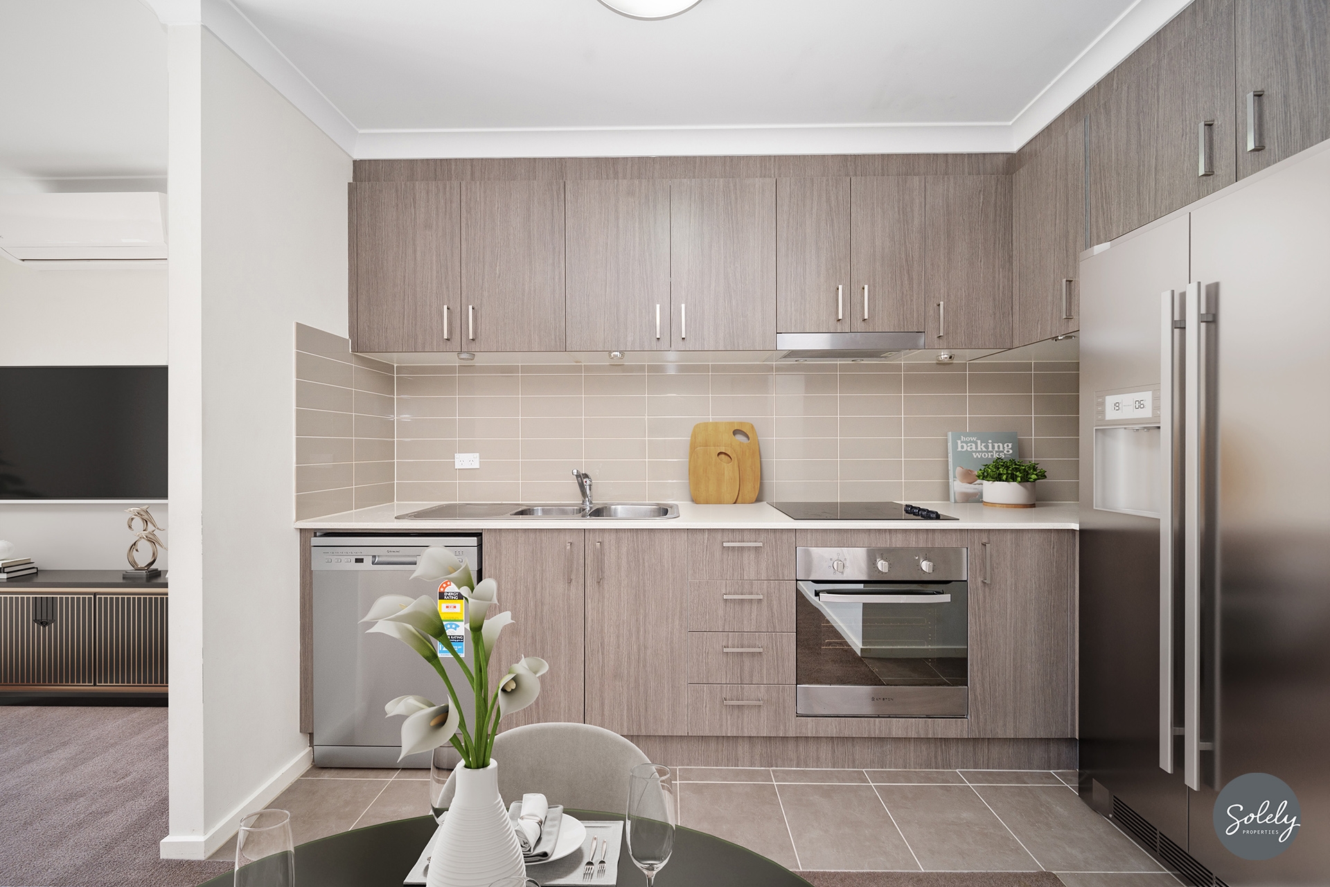 * One-wall kitchen features stone benches, and an Ariston and Stirling appliance package including an electric cooktop, an electric oven and dishwasher