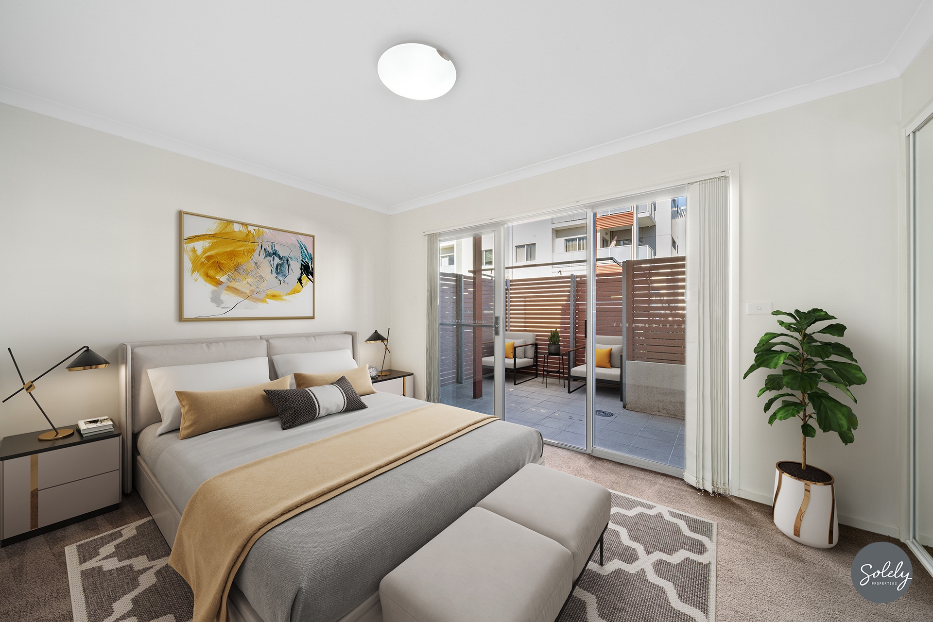 Designed for a modern and comfortable lifestyle, it features intercom entry and an open plan gallery interior that creatively combines living, dining and kitchen areas to form an attractive social space. Punctuated by a stylish one-wall layout, the kitchen accommodates a full set of kitchen services, including a refrigerator space, sink, stove, oven and dishwasher. From here, a sliding door leads to a small outdoor courtyard.