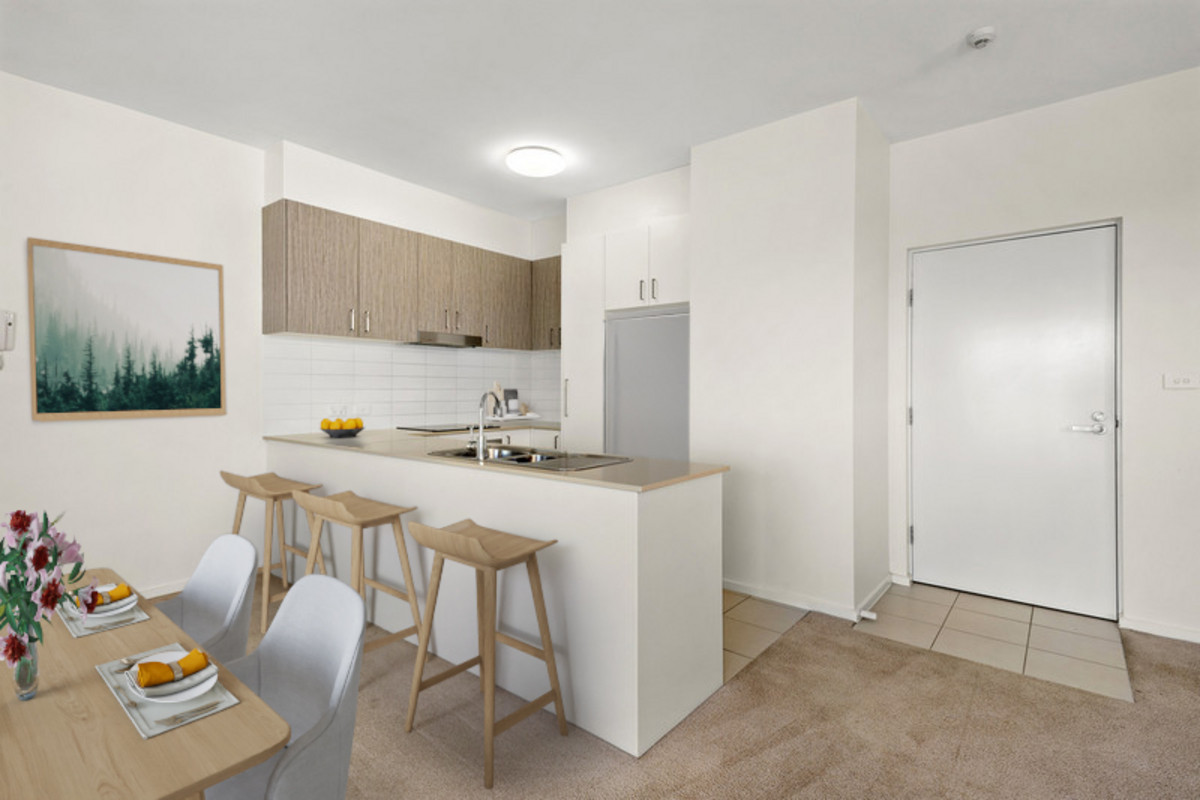 The contemporary kitchen overlooks the living areas and private balcony and is finished in pleasing neutral tones with stone benches, stainless steel appliances and a good amount of storage. Reverse cycle air conditioning keeps you comfortable whatever the weather brings.