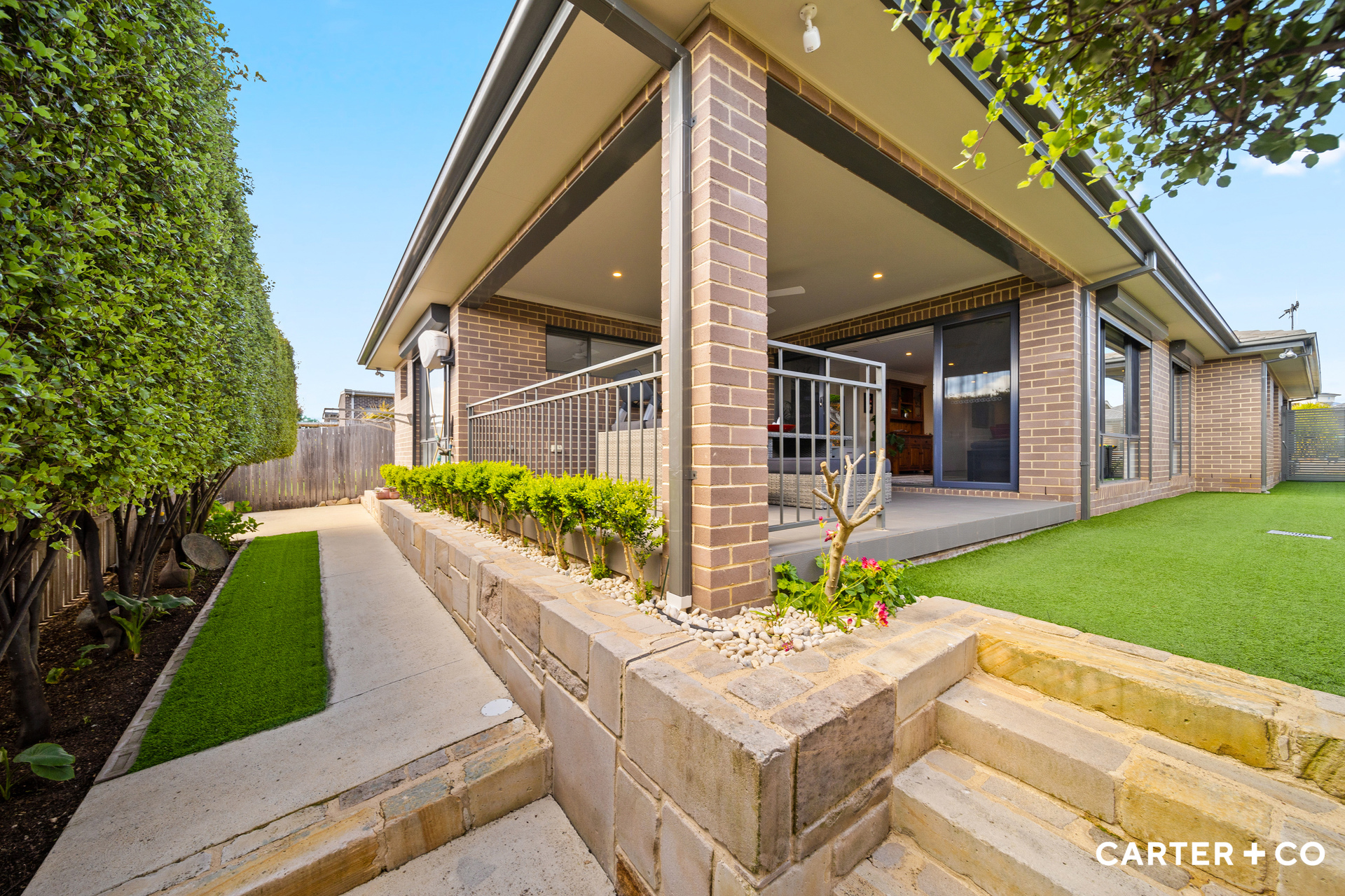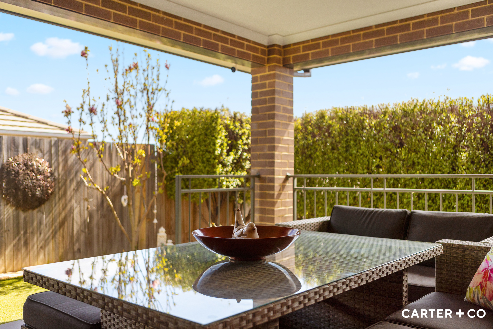 Outdoor living is a breeze with a covered alfresco area, complemented by a low-maintenance garden that provides added privacy. The outdoor space includes faux grass, raised garden beds and established greenery such as a beautiful magnolia tree and privacy hedges.