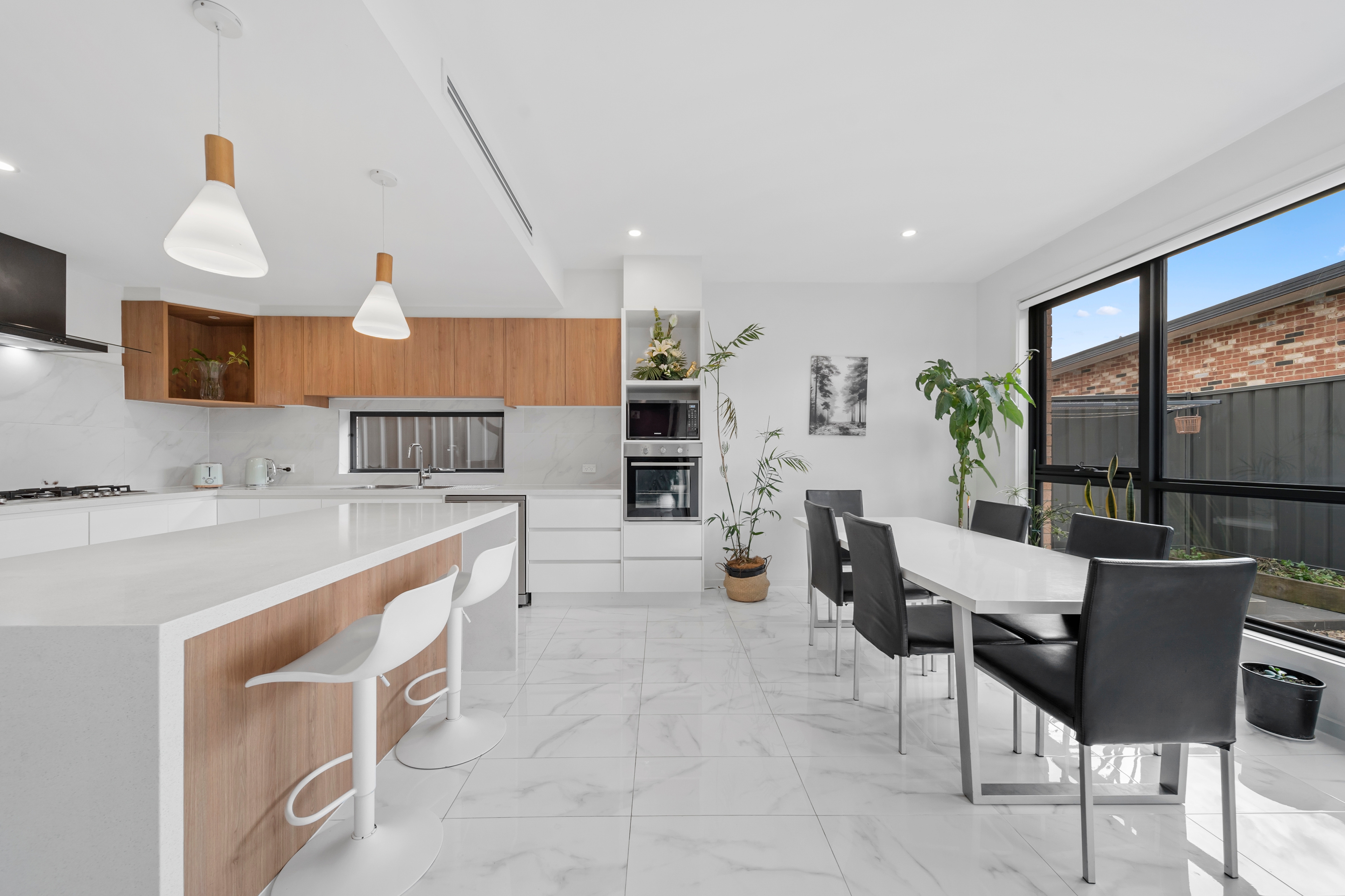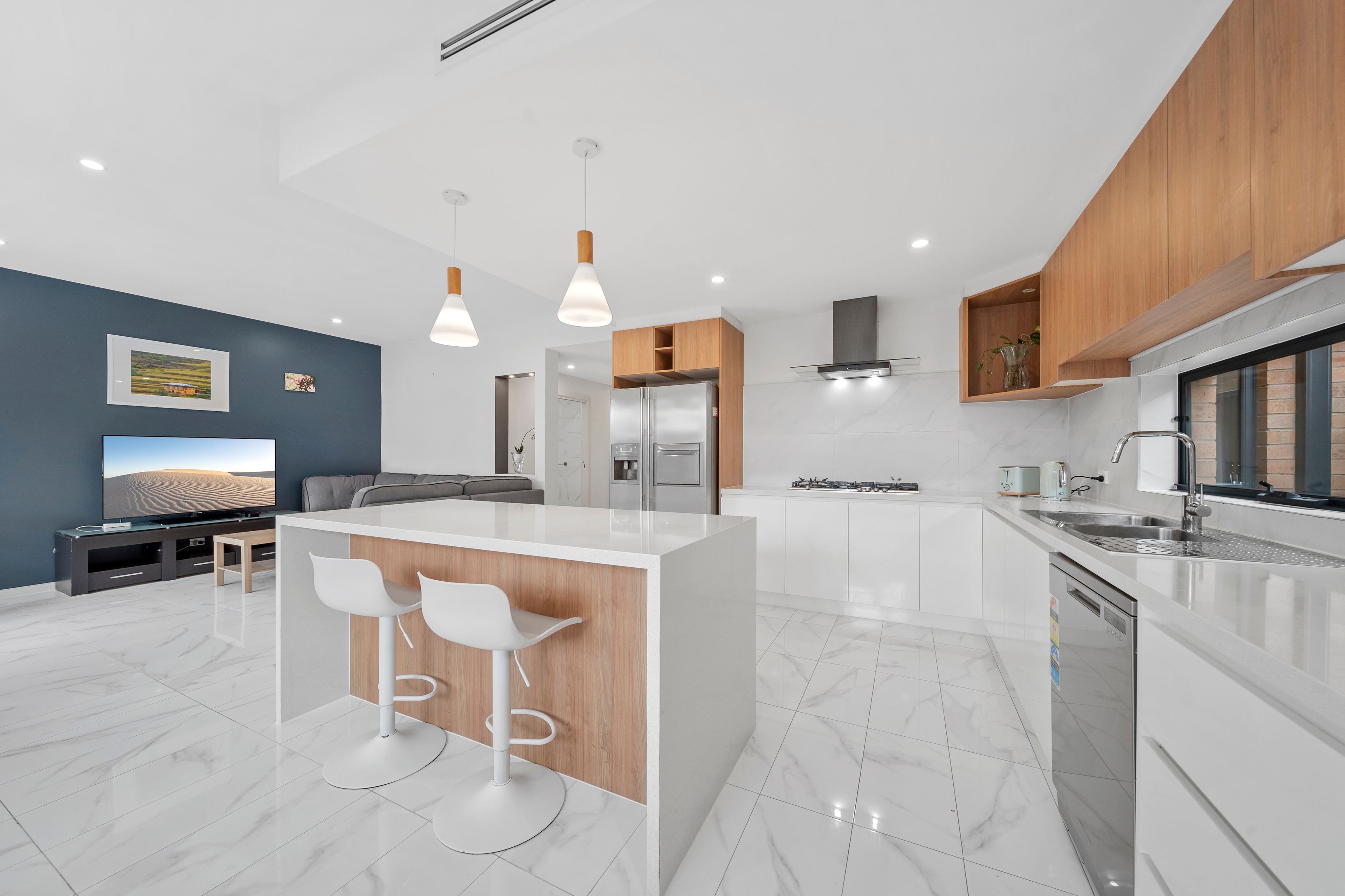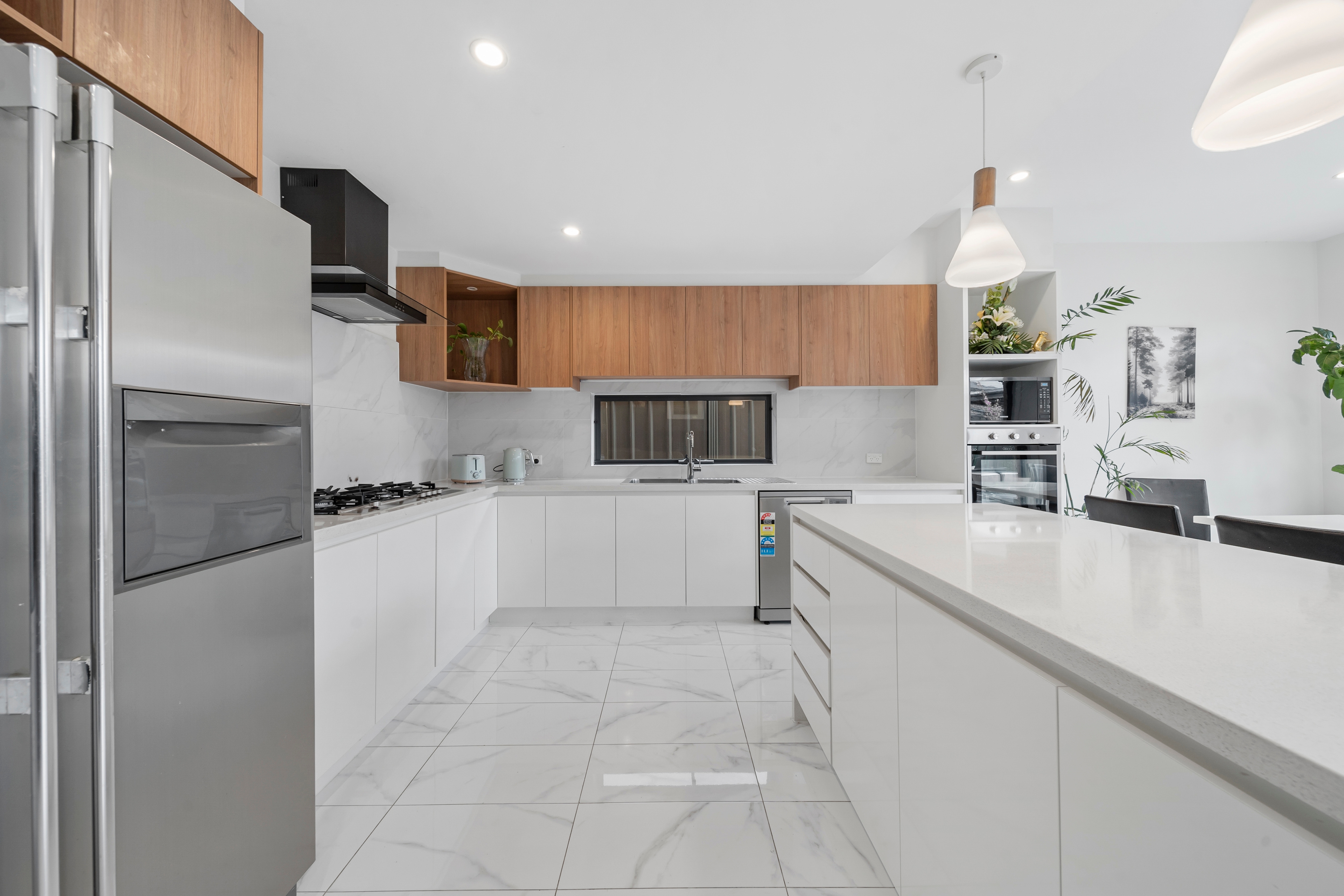 Gourmet Kitchen: - Sleek 20mm waterfall benchtop. - High-end 900mm gas cooktop and 600mm built-in oven. - Soft-close cabinetry and space for a double-door fridge with plumbing. - Pendant lighting in the dining area adds ambiance.