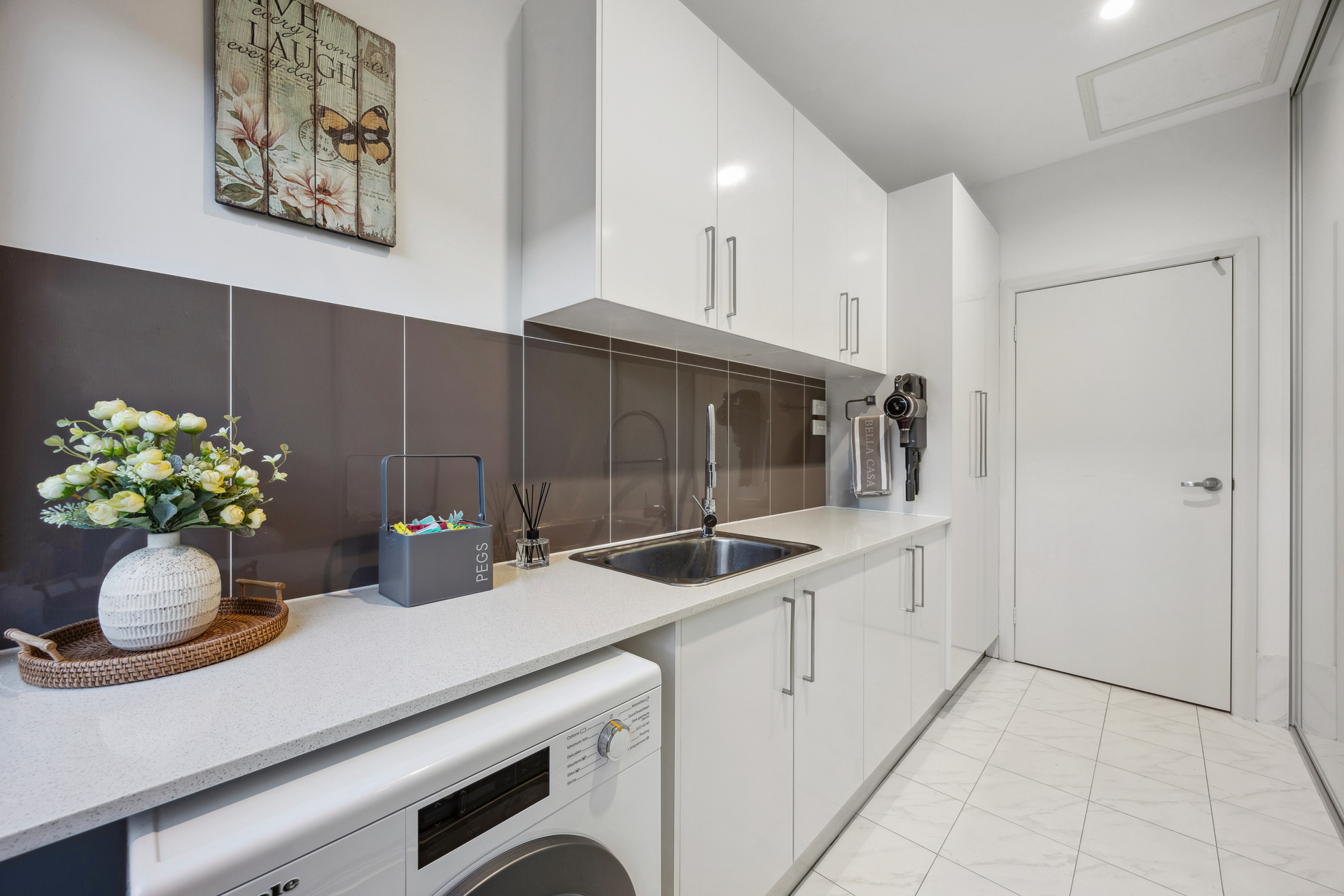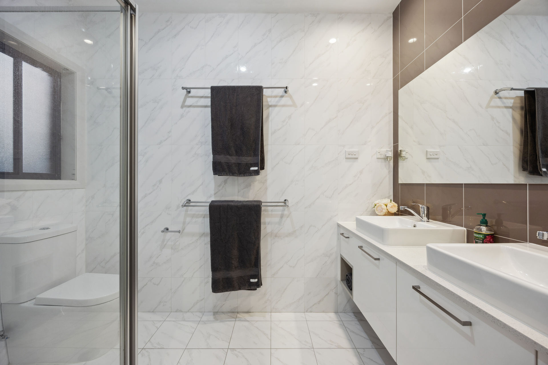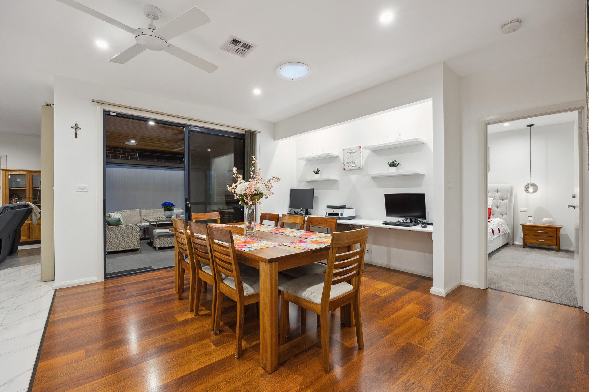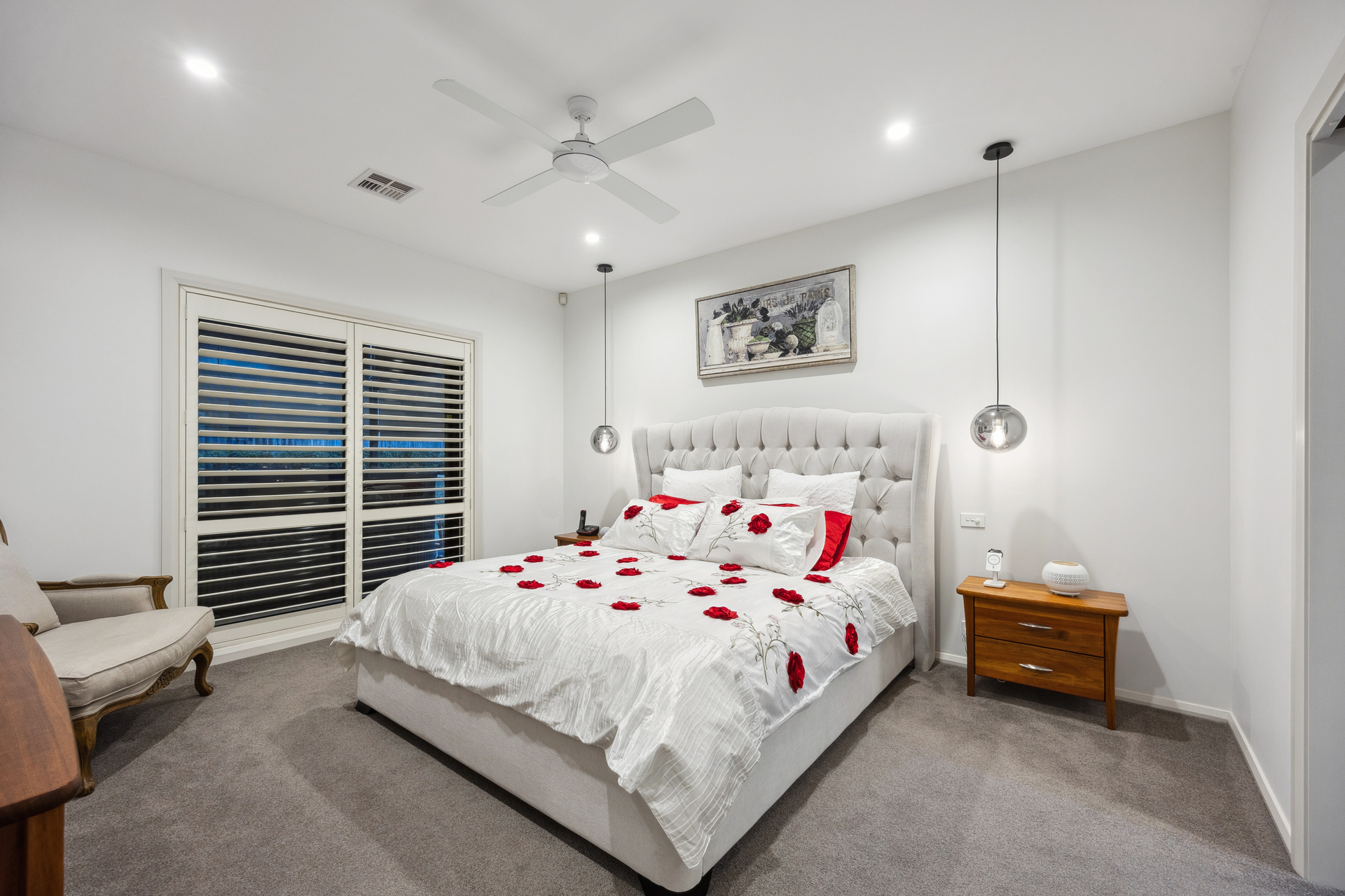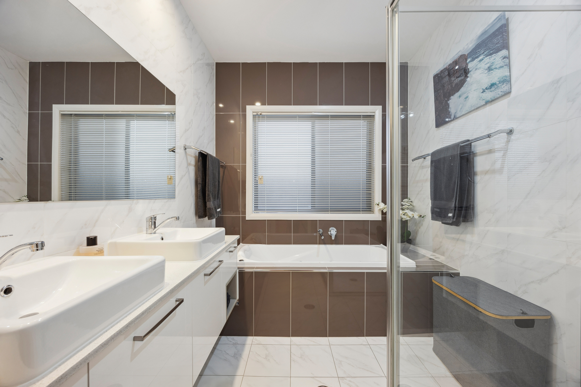 Each of the four spacious bedrooms is designed to be a sanctuary. The master suite offers a walk-in robe with ample storage and an ensuite bathroom with floor-to-ceiling tiling, a rain shower, and dual basins. The additional bedrooms are equally impressive, with built-in wardrobes, ceiling fans, and dimmable LED downlights, ensuring comfort and style for every family member or guest.