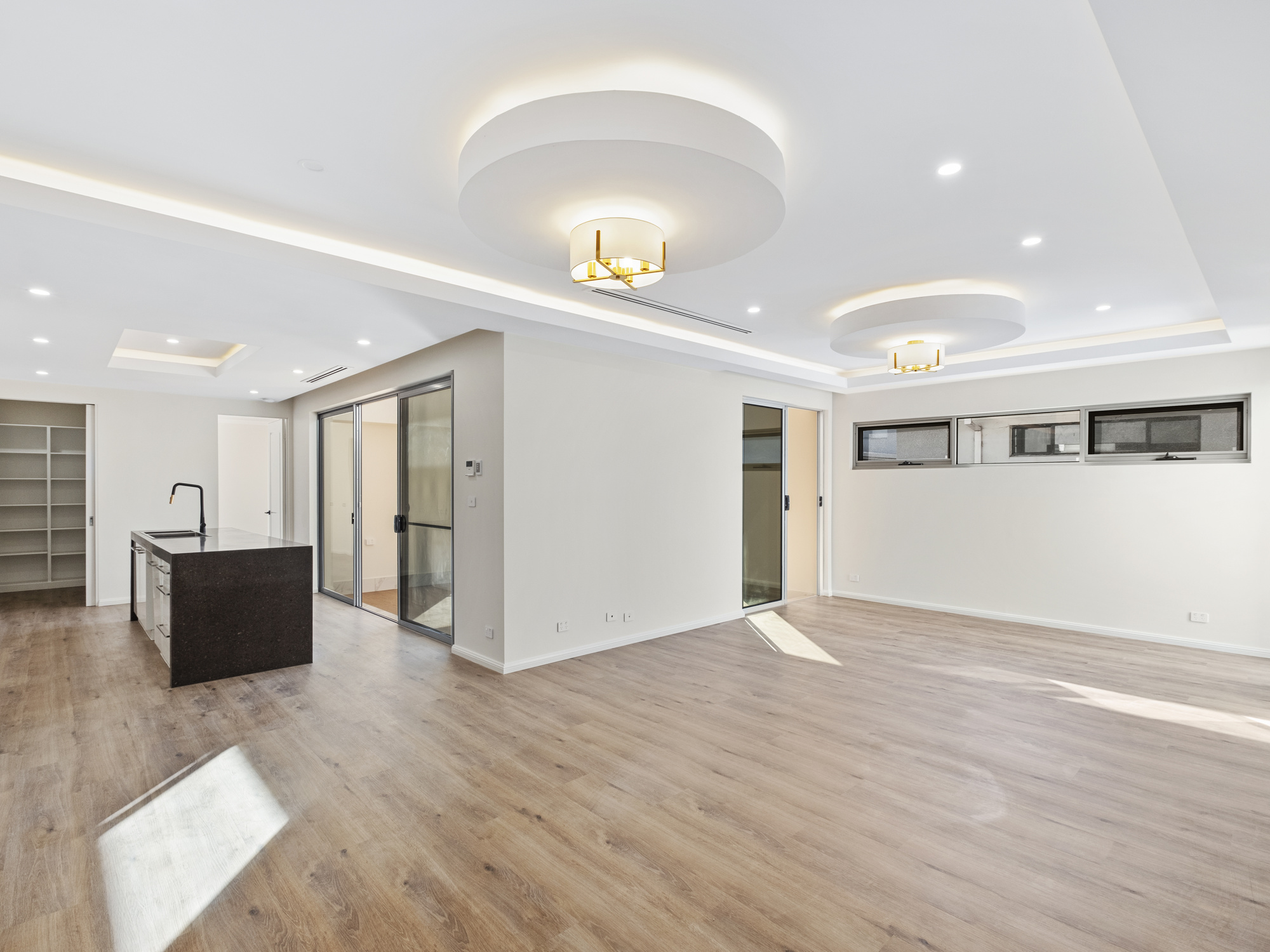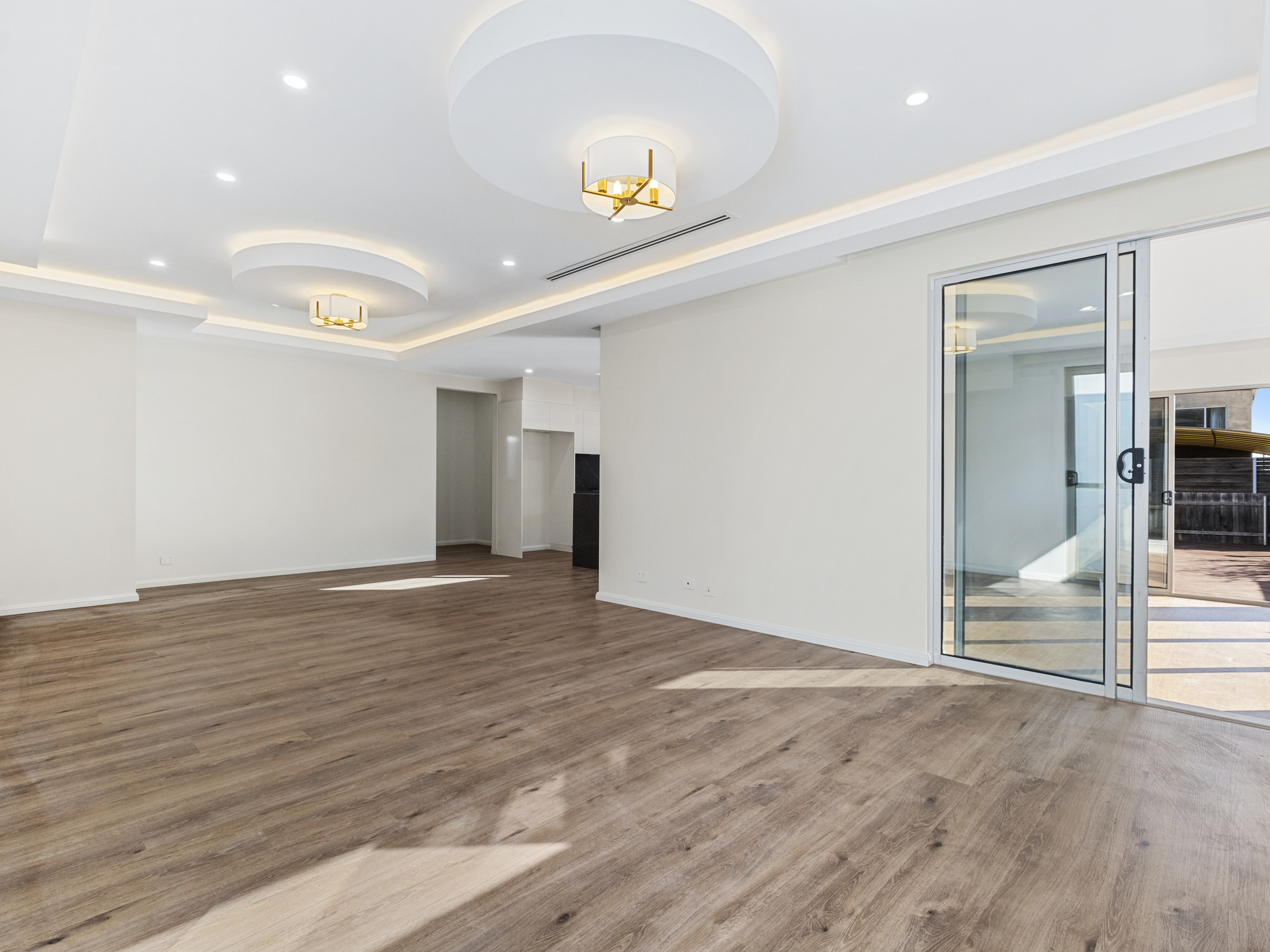 As you enter, you're greeted by a cozy living room at the front, perfect for relaxation. A step-up leads to the main open-plan living area, seamlessly connecting the dining and family spaces. This area opens to an enclosed alfresco, an idyllic space for dining, entertaining, or simply soaking in the sun.