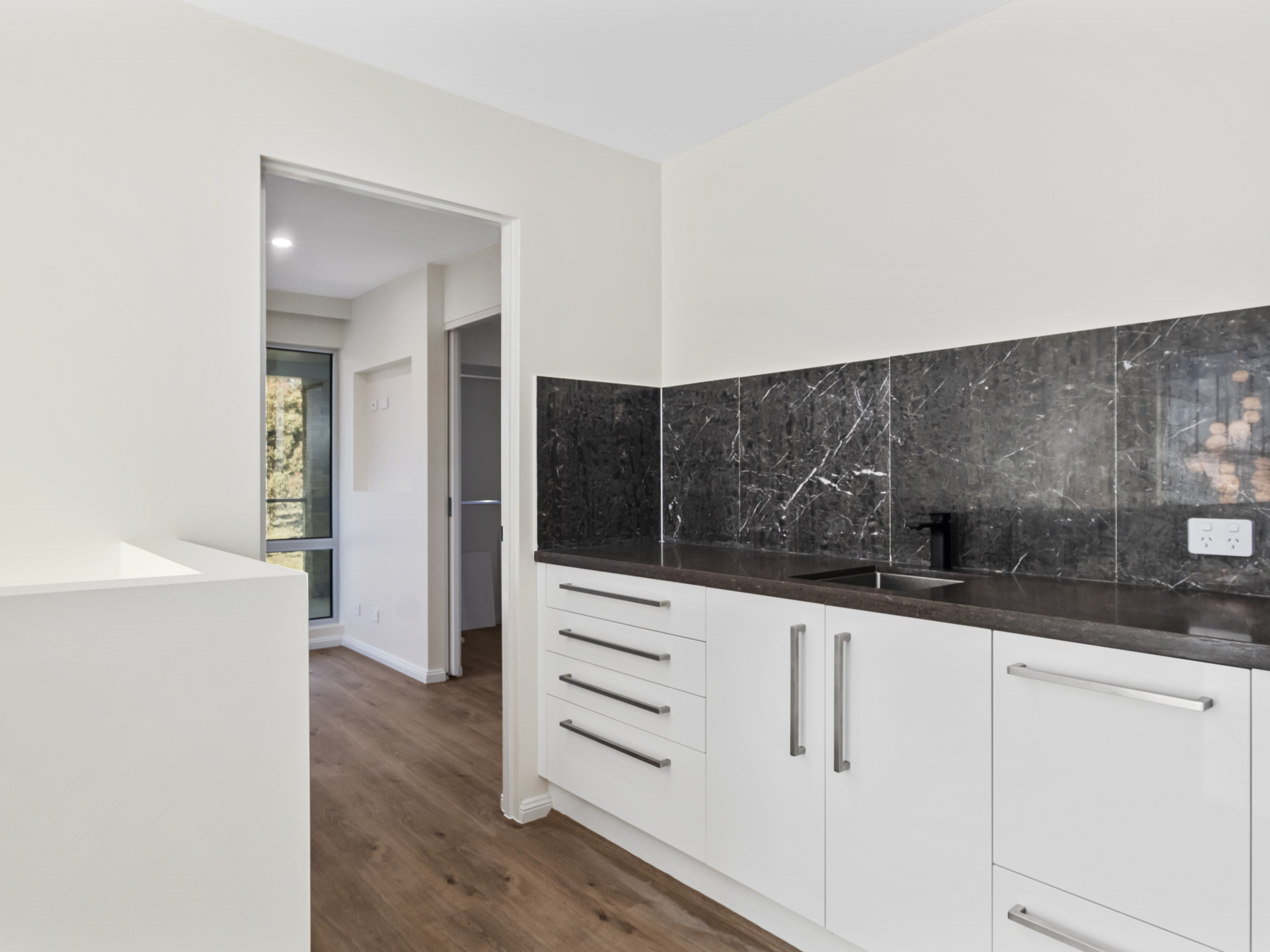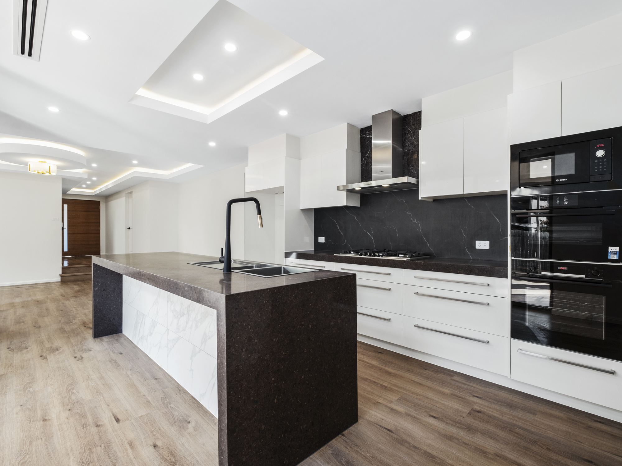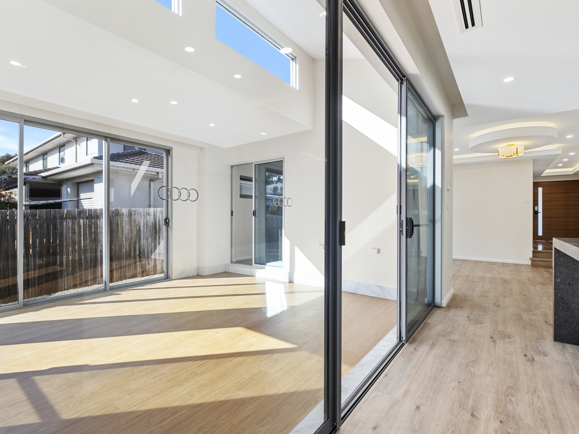 Fully renovated with a fresh, airy ambiance, this home boasts an abundance of natural light, timber-look floors, and marble-featured surfaces throughout its generously scaled layout.