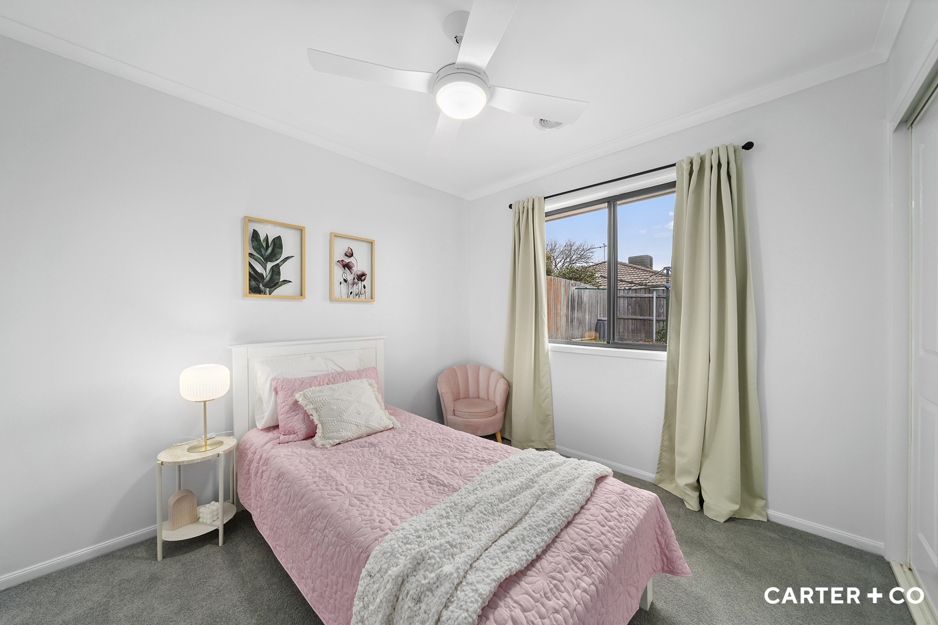 The master bedroom, spacious and serene, offers a walk-in robe and an ensuite, providing a private sanctuary within the bustling household. Bedrooms 2 and 3 both feature built-in robes and ceiling fans, providing comfort and storage solutions. The bathroom boasts a full bath and a new vanity, complemented by a separate toilet and a convenient laundry area with ample storage.