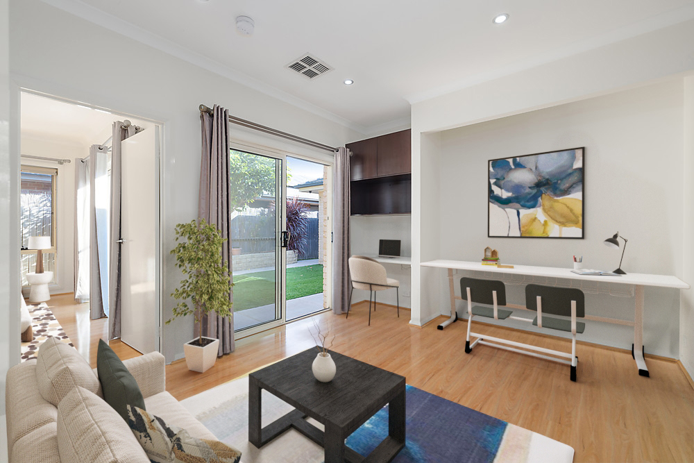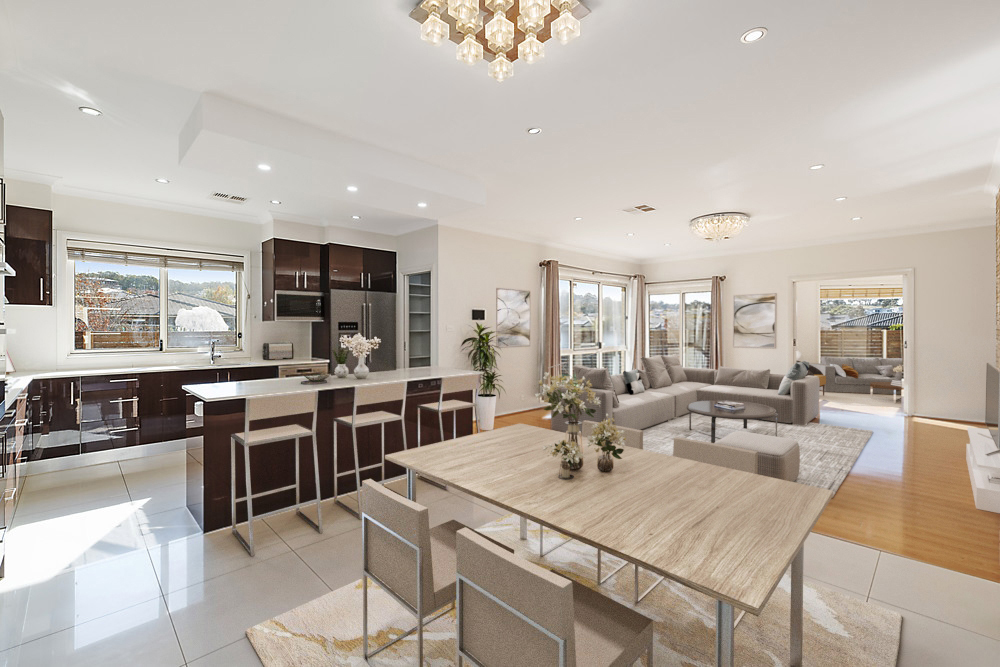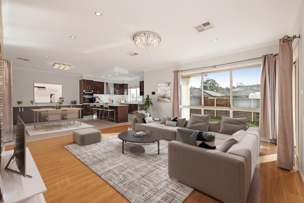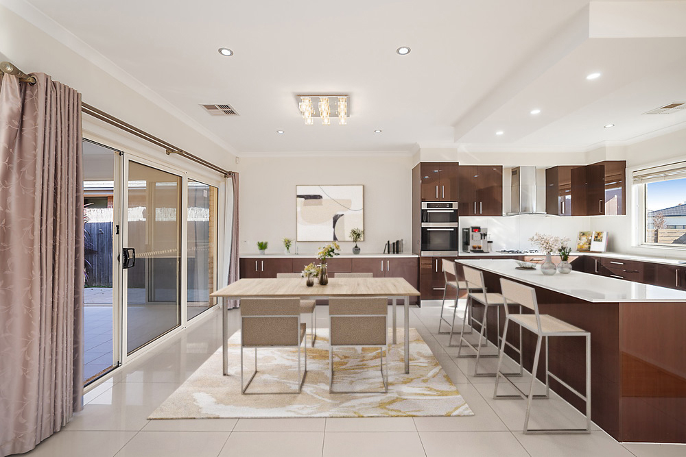 The bright formal living room exudes warmth and comfort, and the dedicated study with a built-in desk is perfect for your work-from-home needs. The expansive open-plan family and dining area is ideal for entertaining, seamlessly flowing into the well-appointed kitchen.