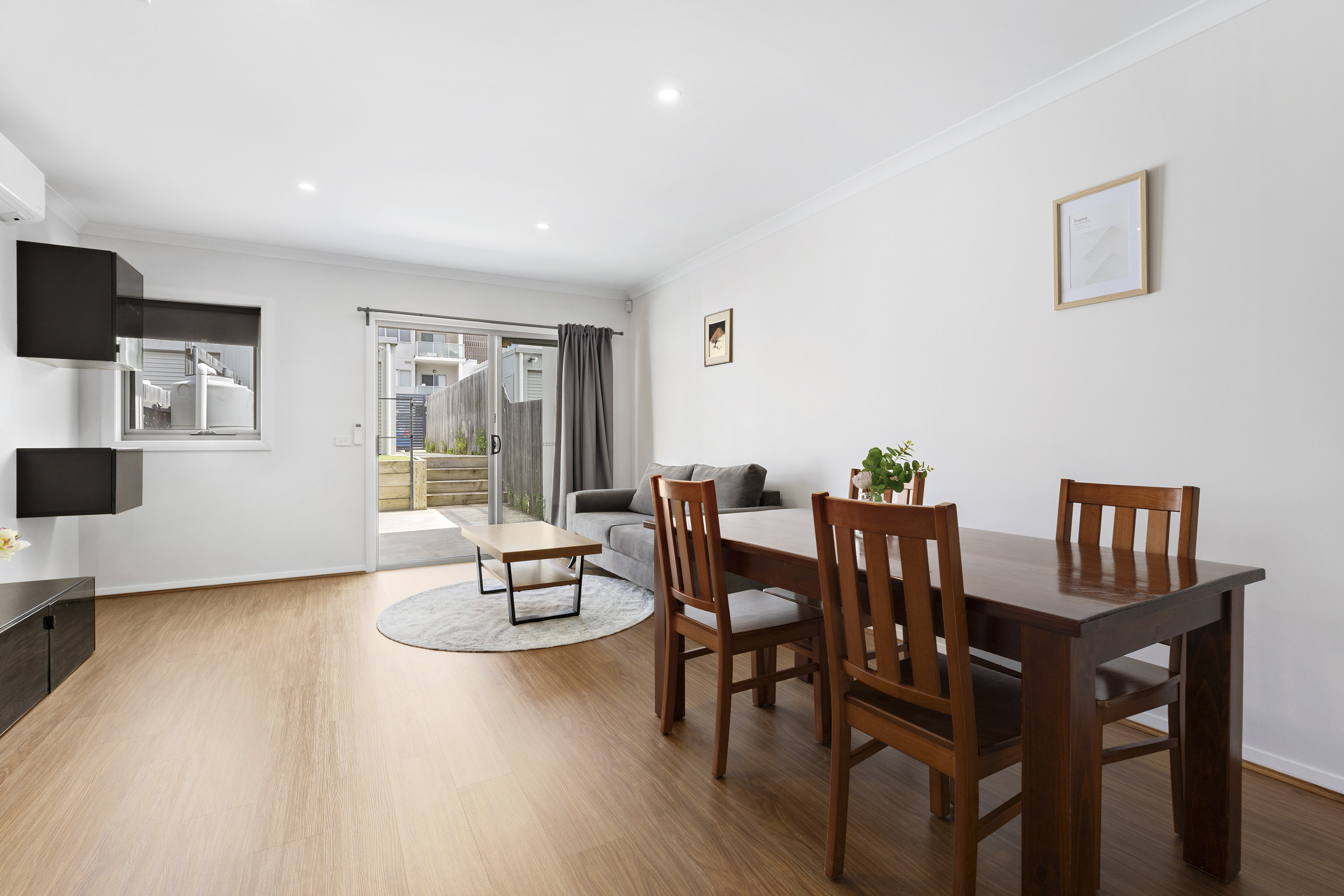 The smart floor plan offers a seamless flow between the open-plan lounge and dining areas, while the modern kitchen impresses with its sleek design, gas cooking, and stone countertops. It connects effortlessly to the living area, perfect for family gatherings or entertaining friends. From here, sliding doors open to a private courtyard, adding a welcoming touch to the home.