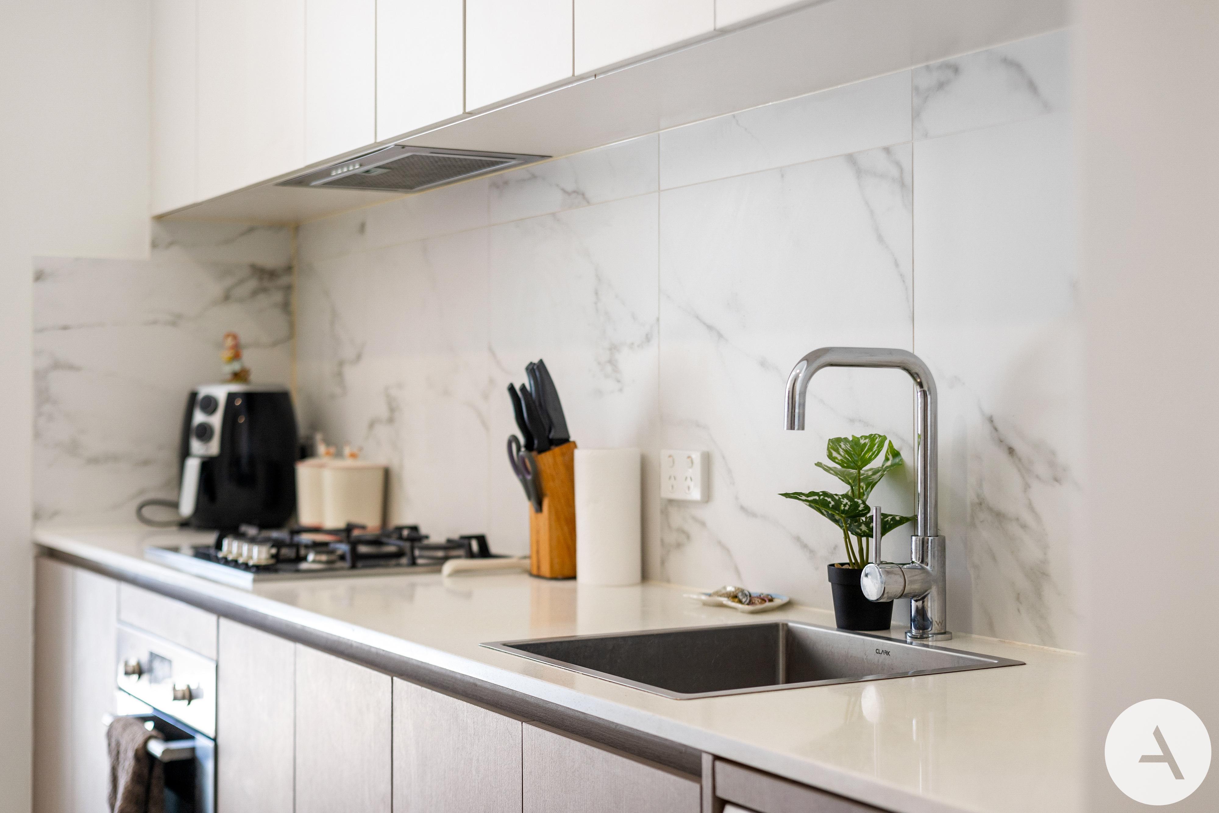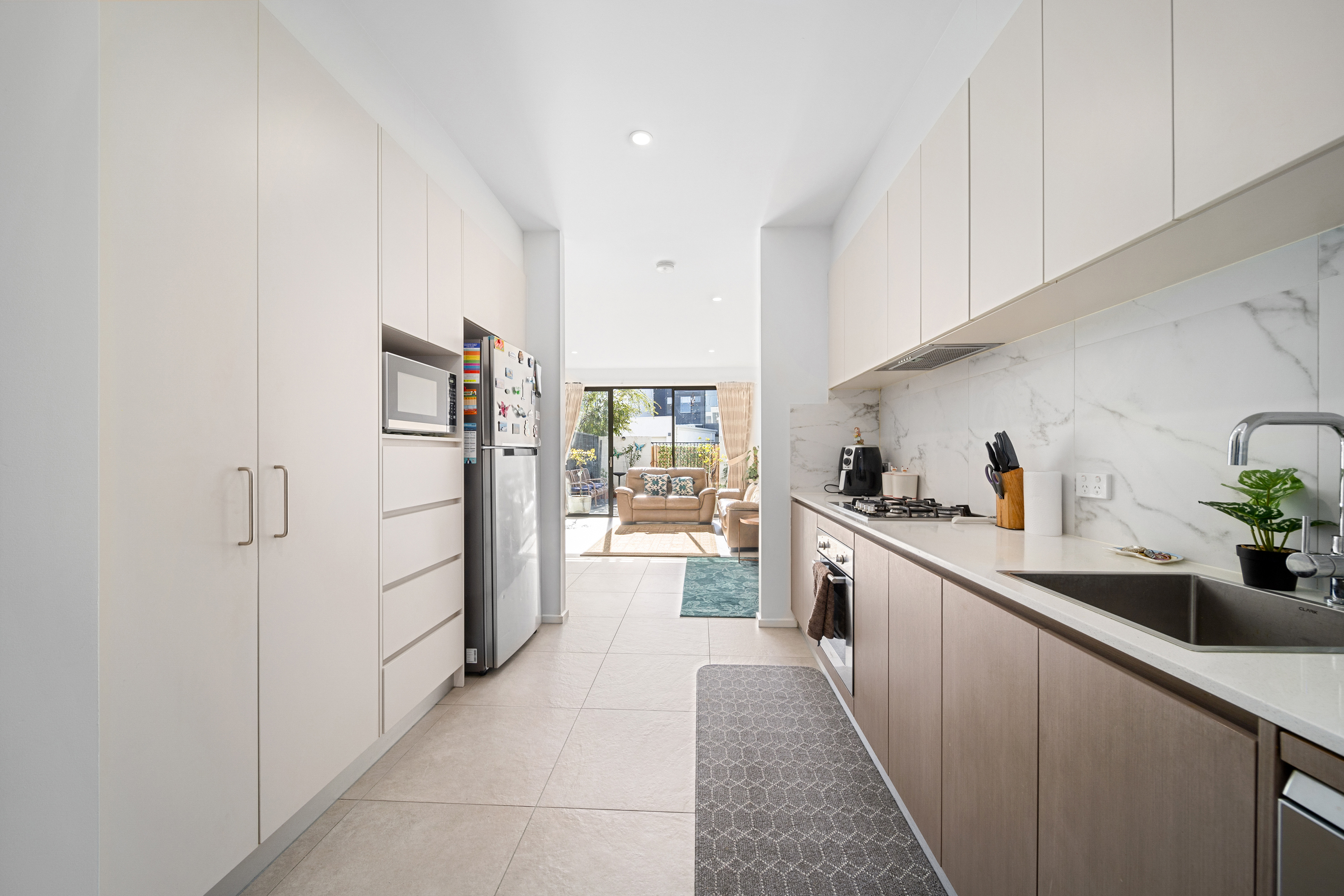 Step inside, and you'll find yourself immersed in an abundance of natural light that accentuates the home's inviting ambiance. The kitchen connects to the open-plan living and dining area, where expansive sliding doors beckon you to the courtyard. The kitchen combines practicality with style, and it is equipped with gas cooking and a dishwasher.