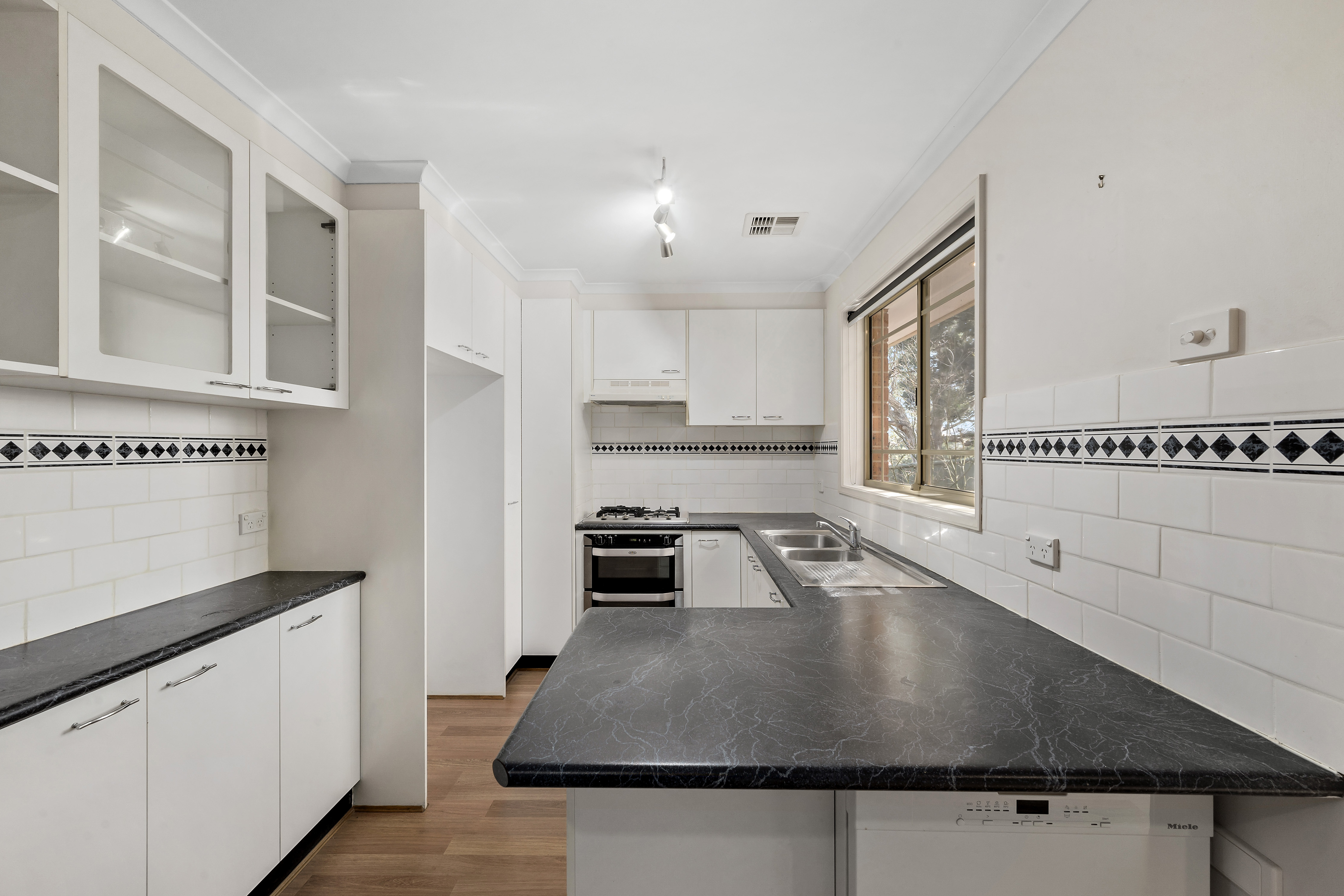 The functional kitchen features easy-clean benches, gas cook top, electric oven & dishwasher.